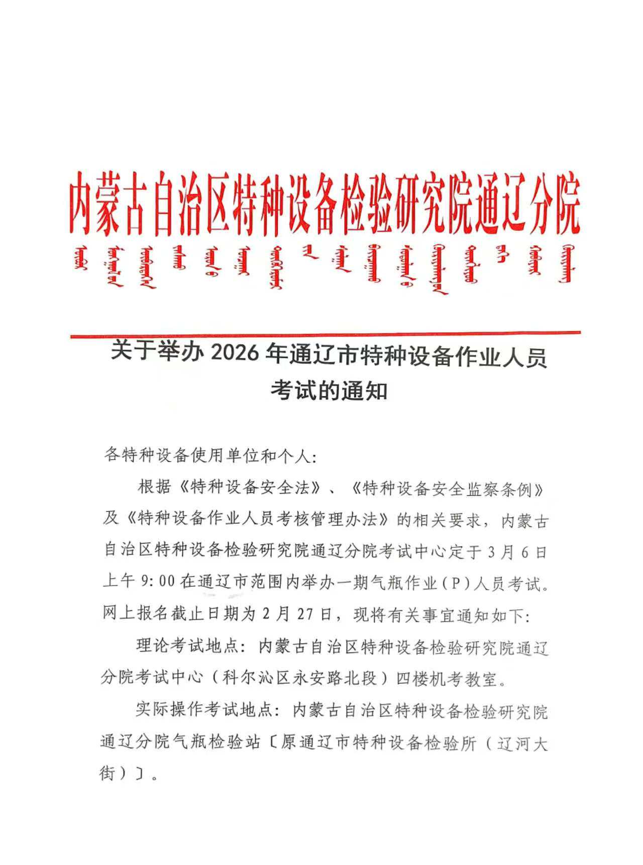 关于举办通辽市特种设备作业人员考试的通知(3月6气瓶)